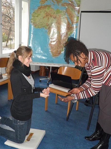 Hinknien, die Hände gewölbt zum dreimaligen Klatschen formen, dabei sagen: wie geht es Ihnen?