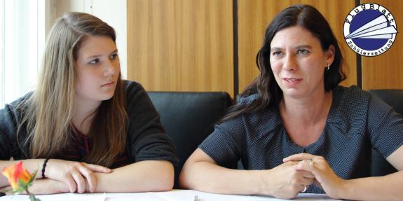 Das Foto zeigt die Schülerzeitungsredakteurin Sophie Zimmermann (Q 2) beim Interviewtermin mit der Berliner Senatorin für Bildung, Jugend und Wissenschaft am 16.5.2013 im Abgeordnetenhaus.